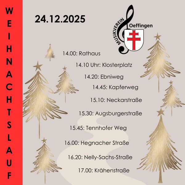 Wer nicht genug von den weihnachtlichen Klängen bekommen kann, darf sich freuen: Die Instrumente werden noch nicht gänzlich eingepackt. Bereits an Heiligabend, dem 24. Dezember, zieht der Musikverein beim traditionellen „Weihnachtslauf“ durch Oeffingen. Die Musikerinnen und Musiker starten um 14:00 Uhr am Rathaus und spielen an verschiedenen Stationen im Ort (wie Klosterplatz, Ebniweg oder Neckarstraße), bevor die Tour gegen 17:00 Uhr in der Krähenstraße endet. So bringt der Verein die festliche Stimmung direkt zu den Menschen vor die Haustür.